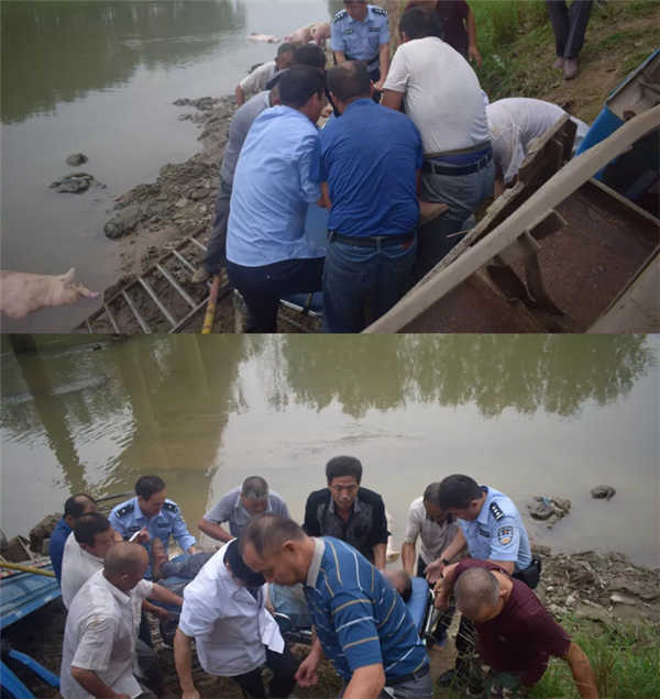 出事的地点是洪河的分洪道,位于临泉县陶老乡与河南省交界处附近的一处石板桥下,民警到达现场发现,一辆蓝色四轮车坠落在桥下的河边,旁边有两头死猪和几头活猪,围观群众正在设法营救被困的驾驶员。