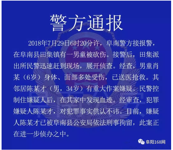 7月29日天很多阜阳人和阜南人的微信群里发现一条信息说是有个6岁男孩被砍伤并且配有血腥图片还有的市民说是小男孩被人贩子砍伤在朋友圈发布视频这是真的假的?谁对一个六岁的孩子下手?阜南县公安局及时发布了警
